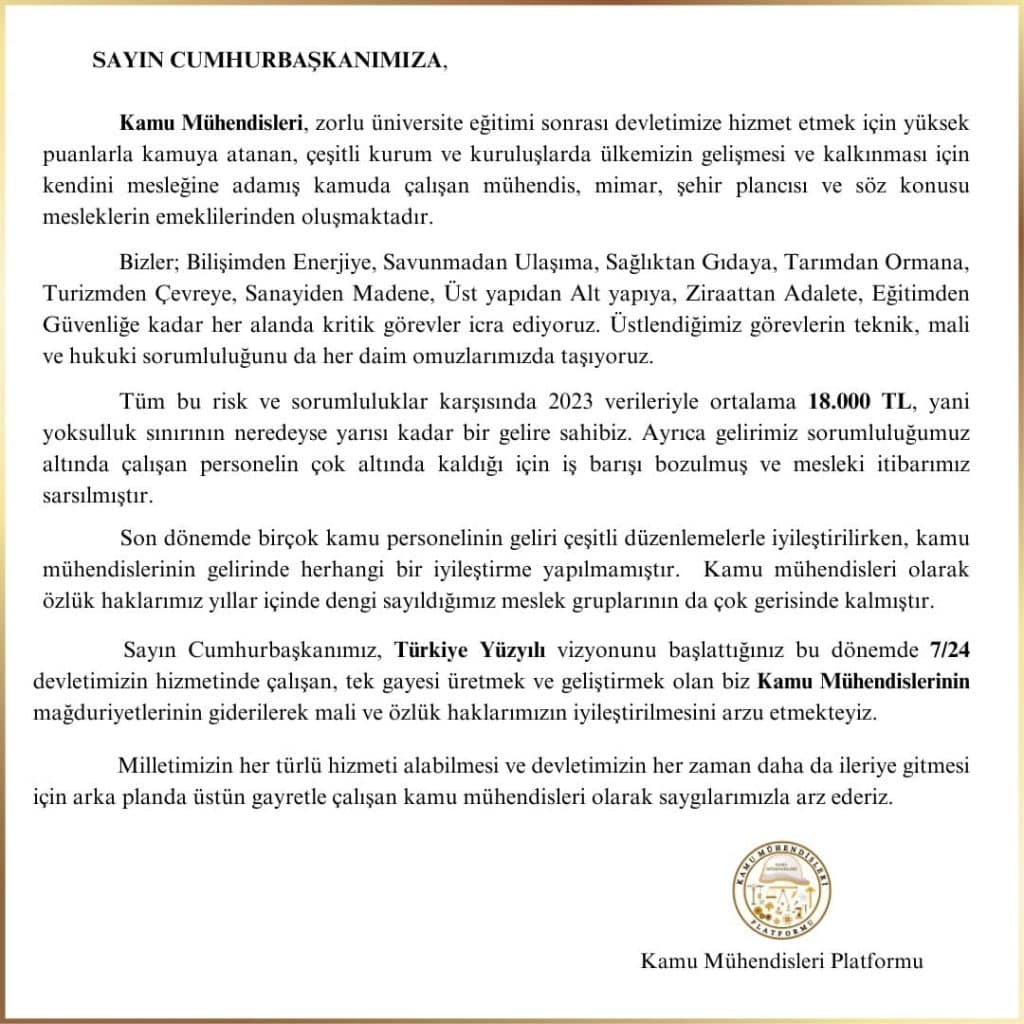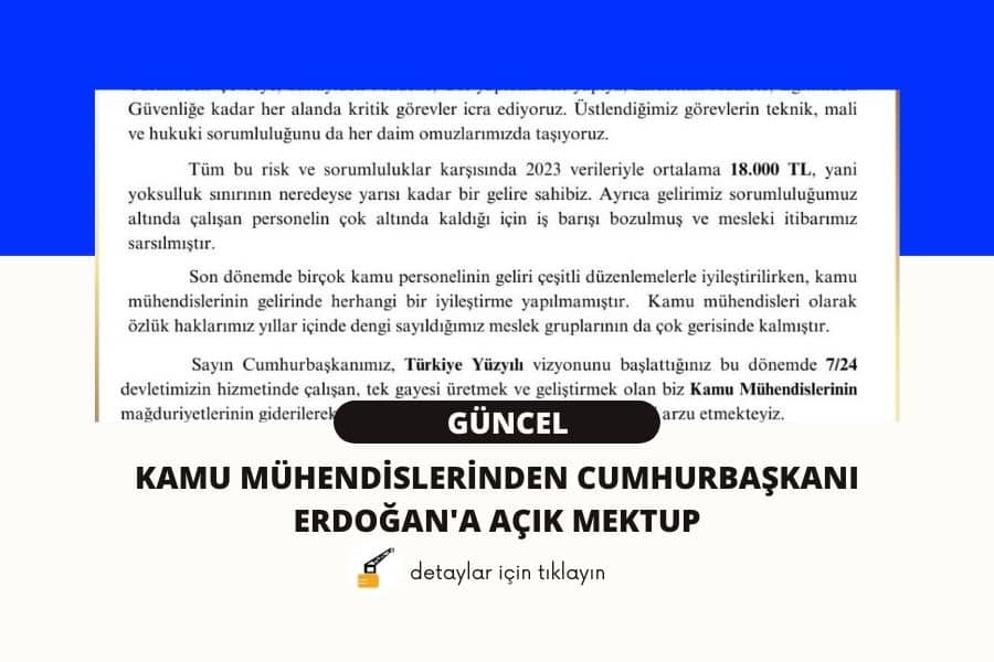 Milyon dolarlık projelere imza atan, deprem sonrası hasar tespit çalışmalarında birçok kez ölüm riski atlatan, yapım ve üretim işleri ile ilgili büyük sorumluluklar alan ve sorumluluğu altında çalışan işçilerden çok daha az maaş alan kamu mühendisleri maaş ve özlük hakları ile ilgili taleplerini TBMM dilekçe komisyonunda, sosyal medyada ve meydanlarda birçok kez dile getirmişti. Kamu mühendisleri Cumhurbaşkanı Recep Tayyip Erdoğan’a açık mektup yazarak isteklerini bir kez daha dile getirdi.