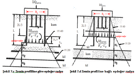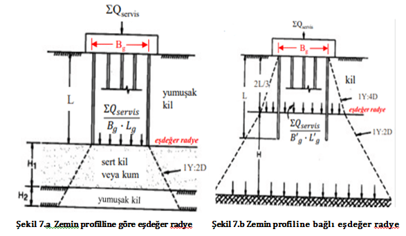 Kazık gruplarının blok halinde oturması eşdeğer radye temel seviyesinden itibaren başlar. Eşdeğer radye temel seviyesi zemin profillerinin çoğunda kazık başlığı tabanından itibaren 2L/3 derinliğinde (L: serbest kazık boyu) olmasına rağmen tabakaların durumuna göre bir kısım farklılıklar arz eder.(şekil.7)
