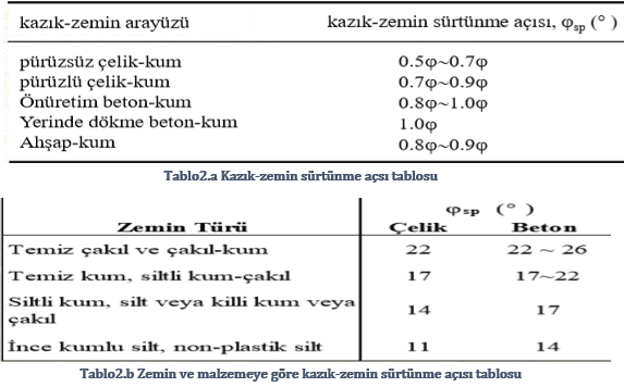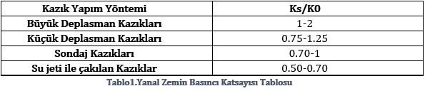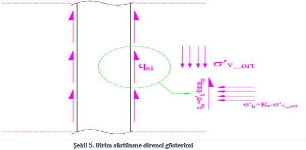 Birim sürtünme direnci kazık-zemin ara yüzünde mobilize olan kayma mukavemeti olarak tanımlanabilir. Bunun hesaplanabilmesi için öncelikle tabaka ortasındaki efektif gerilmenin yatay gerilmeye çevrilmesi gerekir. Bunun için ise Tablo.1’deki değerler kullanılabilir :