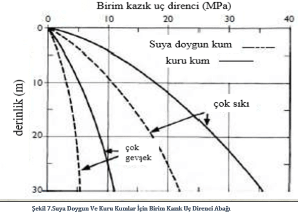 Uç direncinin doğrusal olmayan artışı suya doygun ve kuru kumlar için aşağıda şekil.7 vasıtasıyla gösterilmektedir: