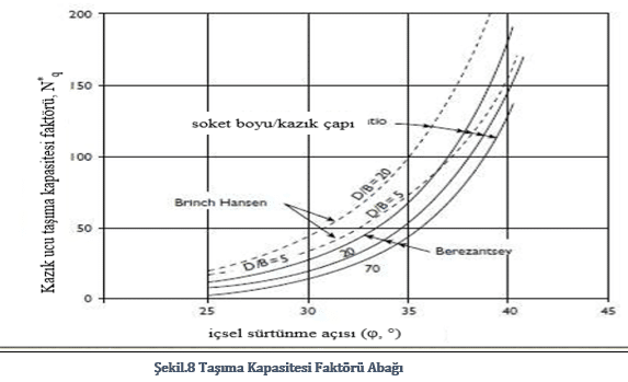 Taşıma kapasitesi faktörü(N*q) Berezantsev veya Brinch-Hansen eğrileri kullanılarak (Şekil.8)bulunabilir: