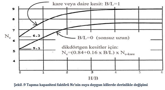 Uç direnci hesabında kullanılan taşıma kapasitesi faktörü Nc=9.0 alınır. Bu parametre bilindiği üzere temel derinliği arttıkça asimptotik olarak 9.0’a yakınsamaktadır.(Şekil.9)