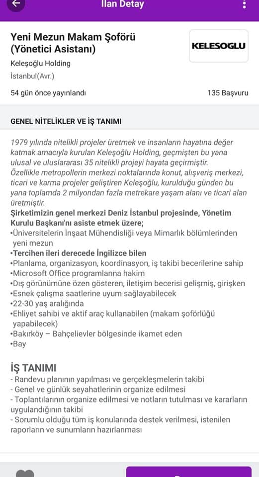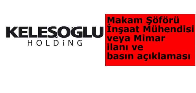 Keleşoğlu Holding geçtiğimiz günlerde kariyer.net ‘te “Yeni Mezun Makam Şoförü (Yönetici Asistanı) başlıklı, inşaat mühendisliği veya mimarlık bölümlerinden mezun, iyi derecede ingilizce bilen ehliyet sahibi ve aktif araç kullanabilen (makam şoförlüğü yapabilecek) gibi kriterleri bulunan bir ilan paylaşmıştı.