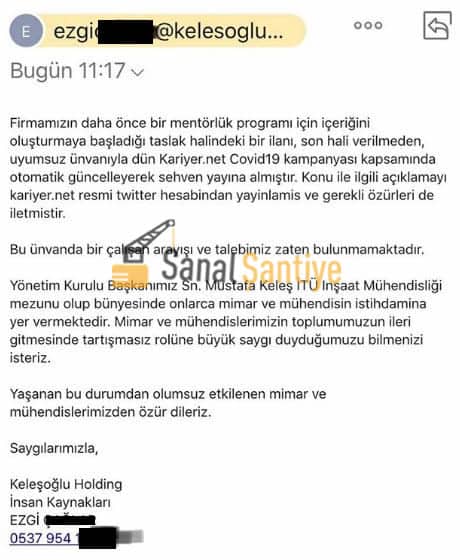 Keleşoğlu Holding İnsan Kaynakları Uzmanı Ezgi Hanım tarafından da e-postamıza konu ile ilgili taslak bir ilanın, kariyer.net tarafından sehven yayına alındığını belirten ve etkilenen tüm mühendis ve mimarlardan özür dileğini belirten bir e-posta aldık.