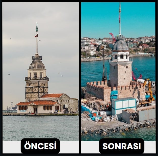 Kız Kulesi Restorasyonunun ardından geçmiş haliyle şimdiki halinin kıyaslaması