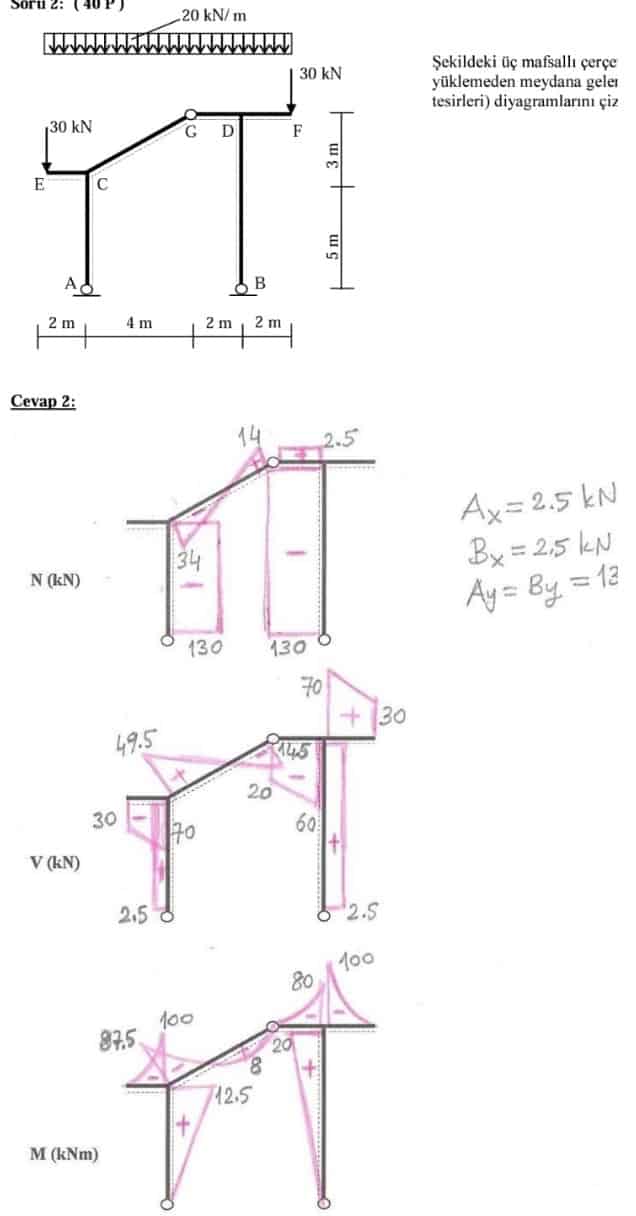Soru Bize mafsal bölgelerinde ki bilinmeyenleri nadiren de olsa isteyebilir. Burada ki bilinmeyen kuvvetler Sağ ve sol parçalara bölümünden ancak ulaşılabilir. Mafsal bölgesinde toplam kuvvetler sıfır olduğundan dolayı, sistemin tümüne bakarak çözüm yapılamaz. Kolon ve kirişlerde bulunan mesnet tepkimelerini bulduktan sonra bu sonuca ulaşılabilir. Kolon ve kirişlerin mesnet tepkileri bulunduysa ∑Fx=0 ve ∑Fy=0 yapılarak Gx ve Gy değerleri bulunabilir. Parçalanan sistemlerde Gx ve Gy kuvvetleri birbirinin eşleniğidir. Yani sağ ve sol sistemlerde sağ tarafta bulunan Gx değeri sol taraftaki sistemde -Gx olmalıdır. Aynı durum Gy yani y doğrultusundaki bilinmeyen kuvvetler içinde geçerlidir.