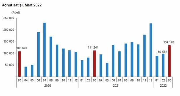 Türkiye İstatistik Kurumu (TÜİK) Mart ayı konut satış verilerini açıkladı. Buna göre Türkiye genelinde konut satışları mart ayında bir önceki yılın aynı ayına göre yüzde 20.6 artarak 134 bin 170 oldu.