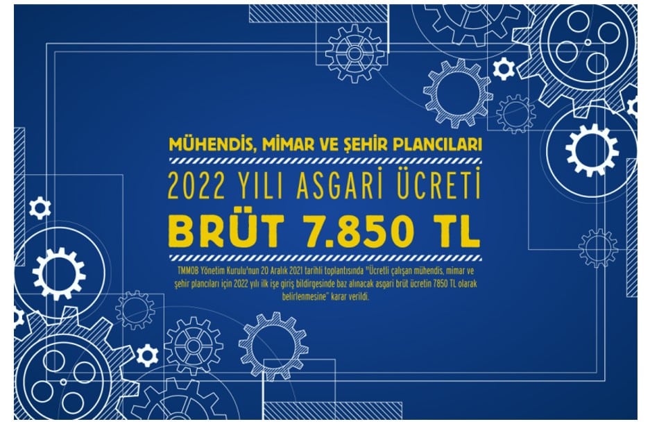 TMMOB Yönetim Kurulu tarafından alınan karar uyarınca ücretli çalışan Mühendis, Mimar ve Şehir Plancıları Asgari Ücreti 2022 yılı için brüt 7.850 TL olarak tespit edildi.