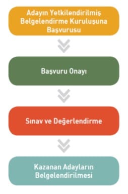 Sınav ve belgelendirme sürecinin tamamı yetkilendirilmiş belgelendirme kuruluşlarınca yürütülür, bireyler sınav başvurularını belge almak istedikleri ulusal yeterliliklerde yetkilendirilmiş belgelendirme kuruluşlarına yaparlar.