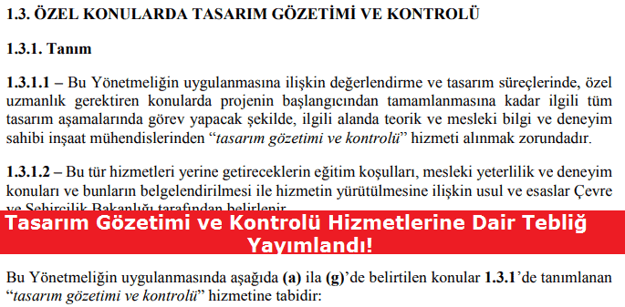 TBDY 2018’in 1.3. Özel Konularda Tasarım Gözetimi ve Kontrolü maddesinde bahsedilen ve daha önceki deprem yönetmeliğinde bulunmayan bu kavram “özel uzmanlık gerektiren konularda projenin başlangıcından tamamlanmasına kadar olan tüm tasarım aşamalarında görev yapacak şekilde, ilgili alanda teorik ve mesleki bilgi ve deneyim sahibi inşaat mühendislerinden “tasarım gözetimi ve kontrolü” hizmeti alınmak zorundadır” şeklindedir. Söz konusu tebliğ de bu uygulamanın nasıl olacağı yönünde bilgiler vermektedir.