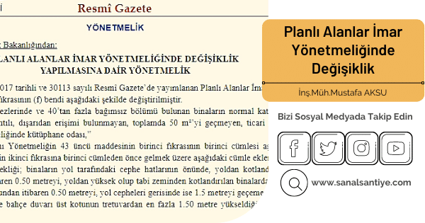 PLANLI ALANLAR İMAR YÖNETMELİĞİNDE DEĞİŞİKLİK YAPILMASINA DAİR YÖNETMELİK MADDE 1 – 3/7/2017 tarihli ve 30113 sayılı Resmî Gazete’de yayımlanan Planlı Alanlar İmar Yönetmeliğinin 22 nci maddesinin birinci fıkrasının (f) bendi aşağıdaki şekilde değiştirilmiştir. “f) Alışveriş merkezlerinde ve 40’tan fazla bağımsız bölümü bulunan binaların normal katlarında, binanın ortak merdiveni ile bağlantılı, dışarıdan erişimi bulunmayan, toplamda 50 m²’yi geçmeyen, ticari kullanıma konu edilemeyen, ortak alan niteliğinde kütüphane odası,” MADDE 2 – Aynı Yönetmeliğin 43 üncü maddesinin birinci fıkrasının birinci cümlesi aşağıdaki şekilde değiştirilmiş, aynı maddenin ikinci fıkrasına birinci cümleden önce gelmek üzere aşağıdaki cümle eklenmiştir. “Bahçe duvarlarının yüksekliği; binaların yol tarafındaki cephe hatlarının önünde, yoldan kotlandırılan binalarda kaldırım üst kotundan itibaren 0.50 metreyi, yoldan yüksek olup tabi zeminden kotlandırılan binalarda ise parselin yol sınırındaki tabii zemin kotundan itibaren 0.50 metreyi, yol cepheleri gerisinde ise 1.5 metreyi geçemez.” “Eğimli yollarda/arazilerde bahçe duvarı üst kotunun tretuvardan en fazla 1.50 metre yükseldiği durumlarda duvar üstten kademelendirilir.” MADDE 3 – Aynı Yönetmeliğin 54 üncü maddesinin on birinci fıkrasına birinci cümlesinden sonra gelmek üzere aşağıdaki cümleler eklenmiştir. “Ancak yapı kullanma izin belgesi bulunan bir yapıda, herhangi bir bağımsız bölüme usulüne uygun olarak düzenlenen yapı kayıt belgesi, yapının ruhsat eki projesine uygun diğer kısımlarında yapılacak tadilata engel teşkil etmez. Bu kapsamda tadilat yapılması, Yapı Kayıt Belgesi olan bağımsız bölüme ilave bir hak sağlamaz. Bu durum yapı ruhsatının diğer hususlar bölümünde belirtilir.” MADDE 4 – Aynı Yönetmeliğin 55 inci maddesinin on ikinci fıkrasına birinci cümlesinden sonra gelmek üzere aşağıdaki cümleler eklenmiştir. “Ancak parselde, usulüne uygun olarak yapı kayıt belgesi düzenlenmiş bir yapının bulunması, parsel için plan ve mevzuat ile belirlenen yapılaşma koşulları dâhilinde yapılacak yeni yapılara engel teşkil etmez. Yapı kayıt belgeli yapının plan ve yönetmelikle verilebilecek azami yapılaşma koşullarını aşan kısımları emsal ve taban alanı hesabında dikkate alınmaz. Yapı ruhsatı düzenlenmesi, yapı kayıt belgesi olan yapıya ilave bir hak sağlamaz.” MADDE 5 – Aynı Yönetmeliğin 57 nci maddesinin yedinci fıkrasına aşağıdaki (a) bendi eklenmiştir. “a) 2000 m²’den büyük parsellerde yapılacak yapılarda mekanik tesisat projesine; çatı yüzeyi yağmur sularının, tabii zemin altında tesis edilecek yağmursuyu toplama tankında toplanması, gerekmesi halinde filtre edilerek yeniden kullanılması amacıyla yağmursuyu toplama sistemi projesi de eklenir. İlgili idarelerce daha küçük parsellere ilişkin de zorunluluk getirilebilir. Yağmursuyu toplama tankı, parselin yan, arka veya parsel sınırına 3 m. den fazla yaklaşmamak kaydı ile ön bahçe zemini altında konumlandırılır. Toplama tankı tahliye hattı varsa yağmursuyu şebekesine bağlanır, atık su şebekesine bağlanamaz.” MADDE 6 – Bu Yönetmelik yayımı tarihinde yürürlüğe girer. MADDE 7 – Bu Yönetmelik hükümlerini Çevre ve Şehircilik Bakanı yürütür.
