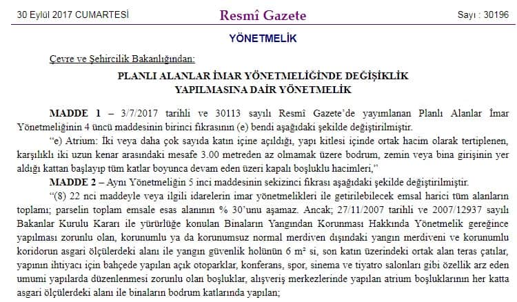 “e) Atrium: İki veya daha çok sayıda katın içine açıldığı, yapı kitlesi içinde ortak hacim olarak tertiplenen, karşılıklı iki uzun kenar arasındaki mesafe 3.00 metreden az olmamak üzere bodrum, zemin veya bina girişinin yer aldığı kattan başlayıp tüm katlar boyunca devam eden üzeri kapalı boşluklu hacimleri,”