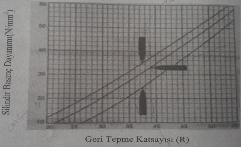 - Bulunan R değeri dönüşüm eğrisinde yerine konularak R değerine karşılık gelen beton basınç dayanımı bulunur.
