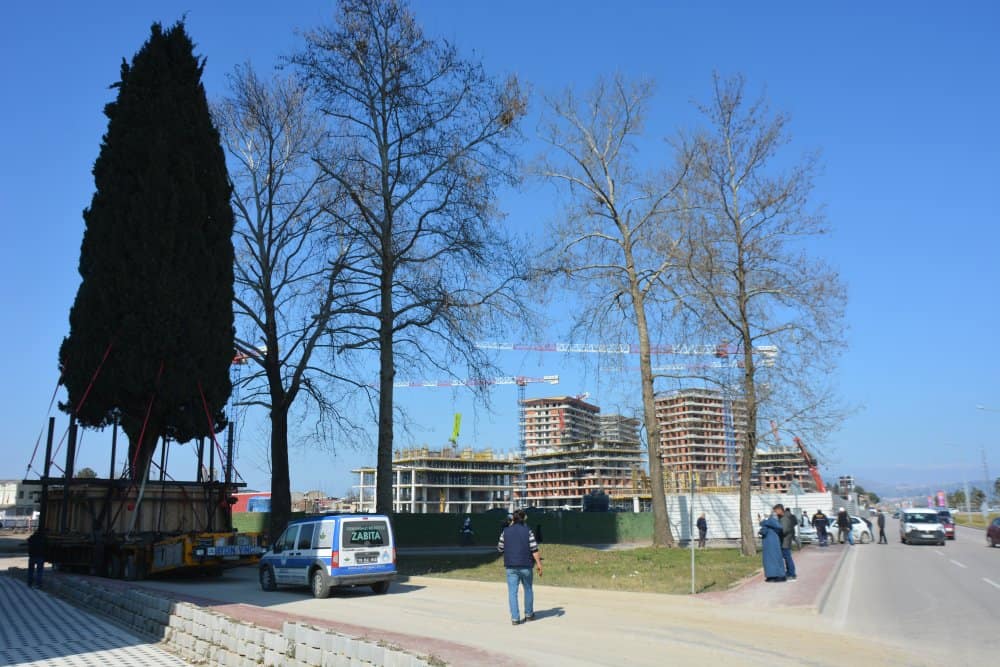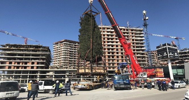 Bursa’da 100 kişinin bir haftalık çalışmasının ardından yerinden sökülen 55 yıllık selvi ağacı, rezidansların arka tarafına yapılacak caminin bahçesine taşındı