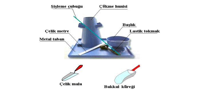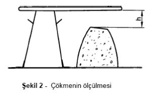 Deney videosunda da görüldüğü gibi, öncelikle metal taban düzgün bir zemine yerleştirilir. Huni mahmuzlarına basarak huninin sabit kalması sağlanır. Huninin 1/3’ü betonla doldurduktan sonra 25 defa şişleme yapılır. Aynı işlem 2 defa daha tekrarlanır. Huninin ağzındaki beton düzlendikten sonra huni düz bir şekilde ve  yavaşça yukarı doğru çekilir. Çekilen huni kalıptan çıkan betonun yanına koyularak çökme miktarı ölçülür(şekil 2).
