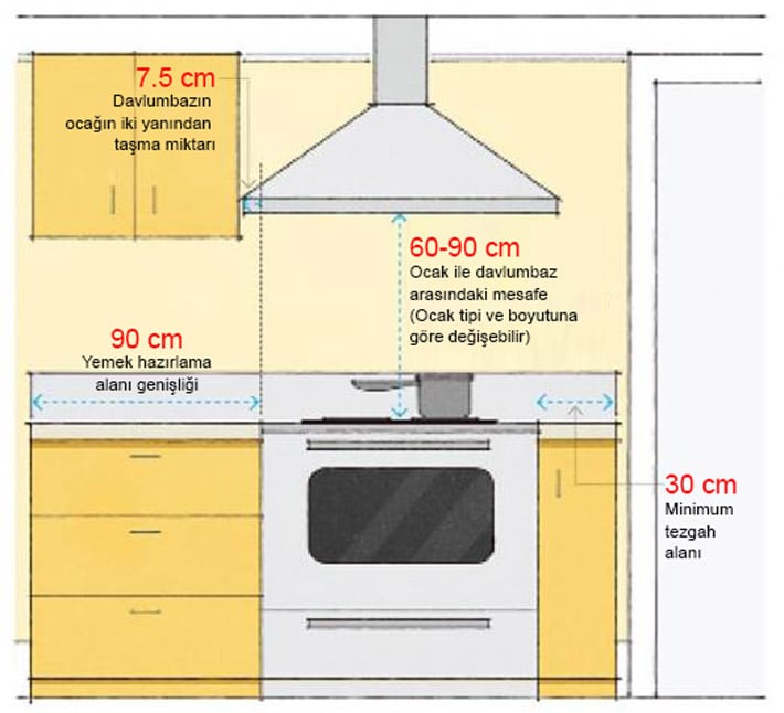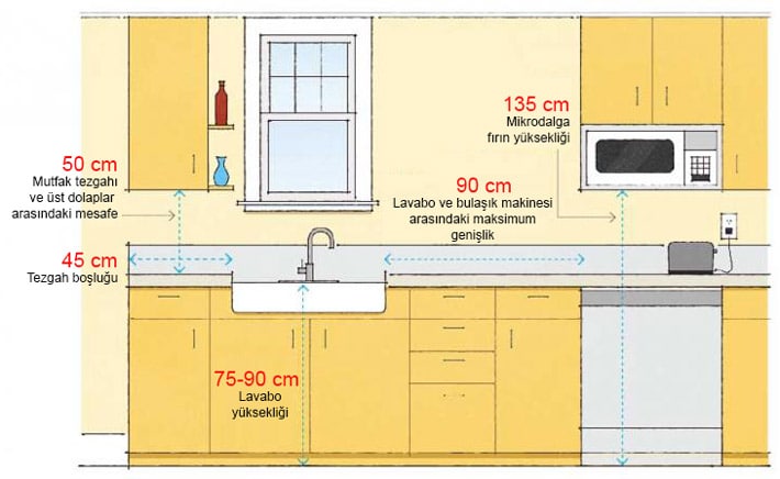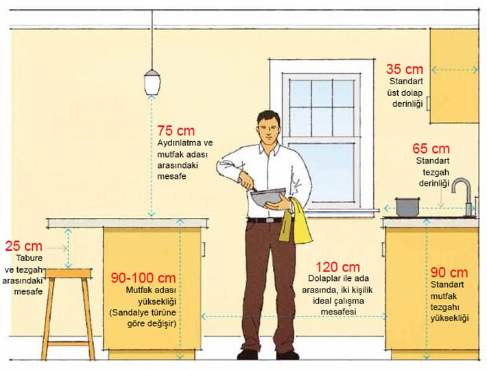 Esasında bu ölçüleri santimetre ile sınırlandırmak yanlış olur. Her mutfağın ebatı farklı olacağı için ölçüler değişiklik gösterebilir. Fakat ergonomi ve standartlar ele alındığında hazır mutfaklar için hazırlanan bu ölçüler yol gösterici olacaktır.