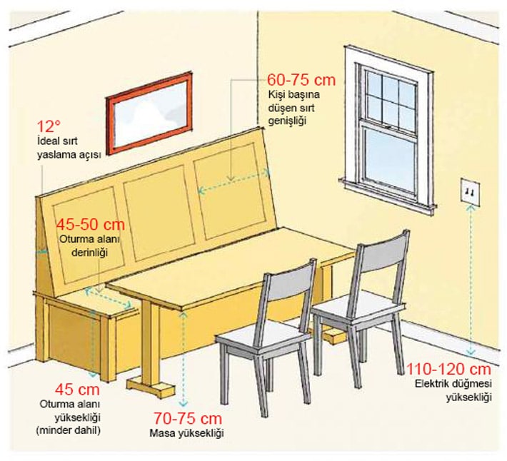 - Mutfak masası yüksekliği: 70 – 75 cm