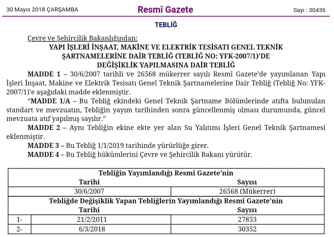 Ayrıca bu tebliğ ile birlikte, aynı tebliğin ekine ekte yer alan Su Yalıtımı İşleri Genel Teknik Şartnamesi eklenmiştir.