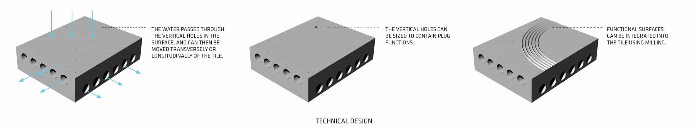 Normal bir kaldırım taşını andıran bu sistem, yağmur suyunu biriktirmek ve dağıtmak üzere geliştirilmiş. Küçük gözenekler sayesinde parkelerin üstüne gelen su yatay olarak bağlanmış kanallara aktarılıyor. Ünite gerektiriyorsa suyu depolayabilir, geciktirebilir, yönünü değiştirebilir.