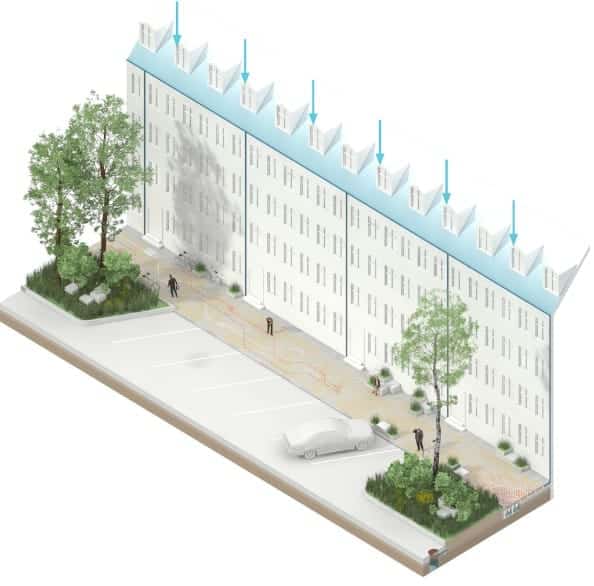 Sistem, toplanan bu suyu yakınlarda bulunan geçirgen bölgelere aktarıyor; bahçe, park gibi.. Böylece geçirgen bölge tarafından su emiliyor.