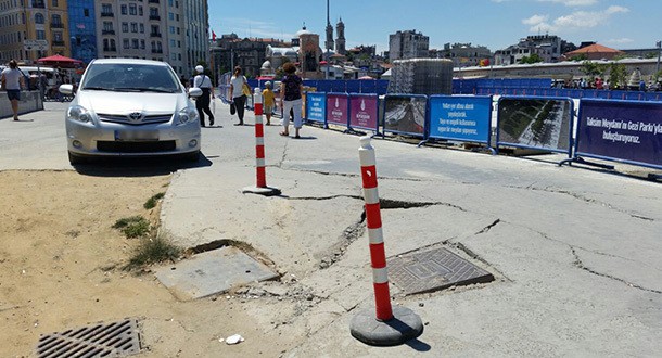 İstanbul Taksim’de çevre düzenlemesi ve parke taşı döşeme çalışmaları nedeniyle asfaltta çökme ve çatlaklar meydana geldi. Çöken kısımda dubalarla önlem alındı.