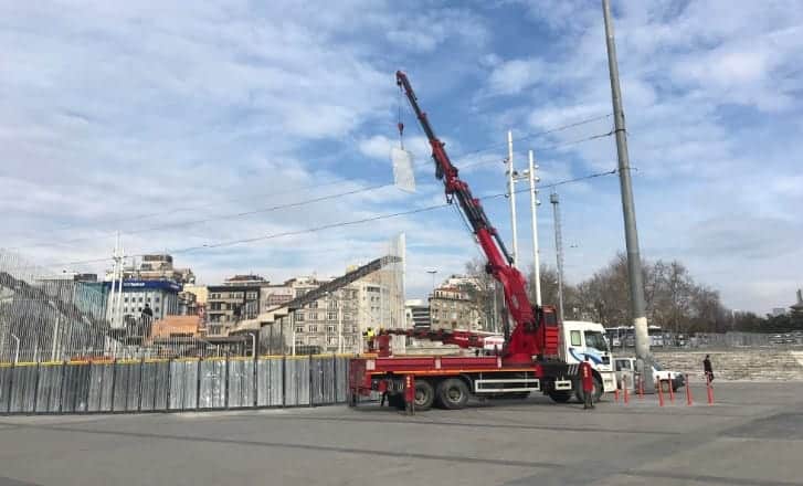 İBB Taksim Meydanı’na, “Kavuşma Durağı” adıyla kurduğu geçici sergi platformu İstanbul 2 Numaralı Kültür Varlıklarını Koruma Bölge Kurulu’nun 7 Şubat tarihli kararı doğrultusunda, sökümüne başlandı. İlk olarak güvenlik gerekçesiyle platformun etrafı demir levhalarla kapatıldı. Daha sonra platformun sökülmesi işlemine başlandı. Bugün ise sabah saatlerinde meydana gelen vinçler yardımıyla söküm işlemlerine devam edildi.