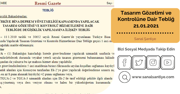 Çevre ve Şehircilik Bakanlığı’nca 21 Ocak 2021 tarihli 31371 sayılı Resmi Gazete’de Türkiye Bina Deprem Yönetmeliği kapsamında yapılacak tasarım gözetimi ve kontrolü hizmetlerine dair tebliğde değişiklik yapılmasına dair tebliğ yayınlandı.