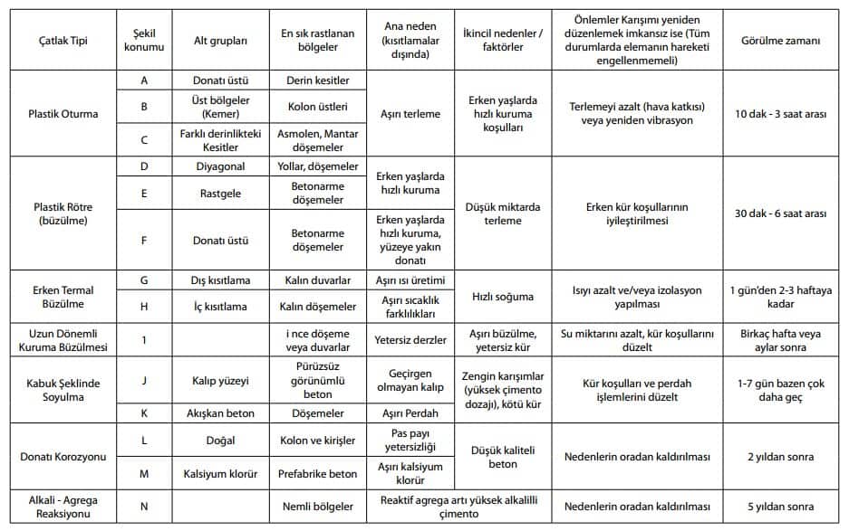 Çatlakların oluşum yerleri ve biçimlerine göre Taze veya Sertleşmiş Betonda Görülen Çatlak Tiplerinin Sınıflandırılması.