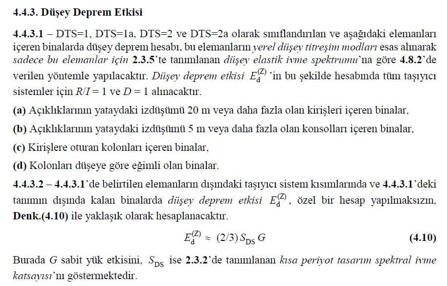 CEVAP 3: Düşey modal analiz yöntemi daha gerçekçi bir yaklaşım olduğundan, 20 metreden büyük kiriş olan ya da 5 metreden uzun konsolu olan ya da kirişe oturan kolonu olan ya da eğik kolonu olan DTS1, DTS1a, DTS2, DTS2a olan yapılarda kullanılması zorunludur.