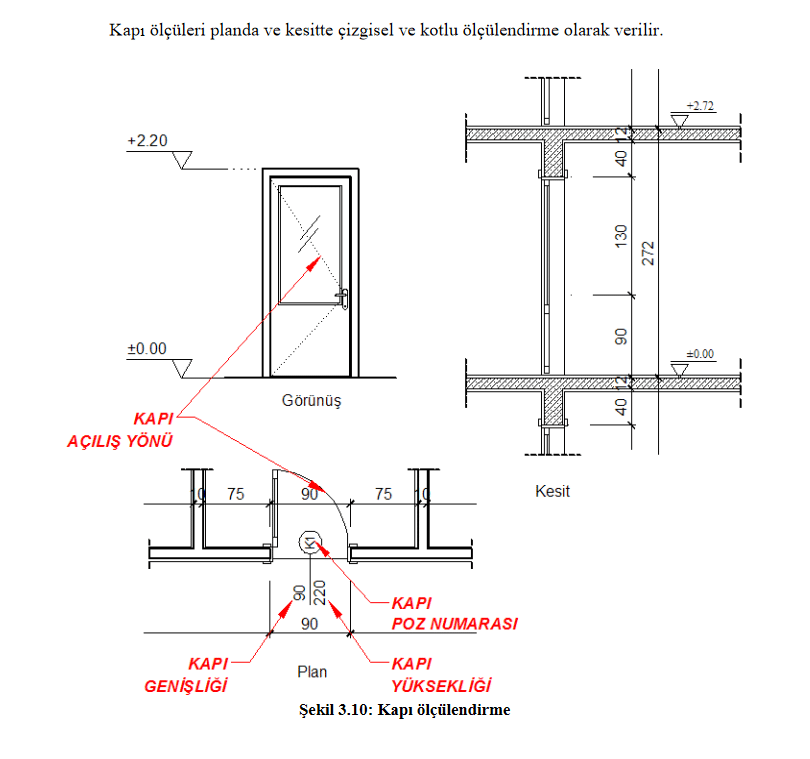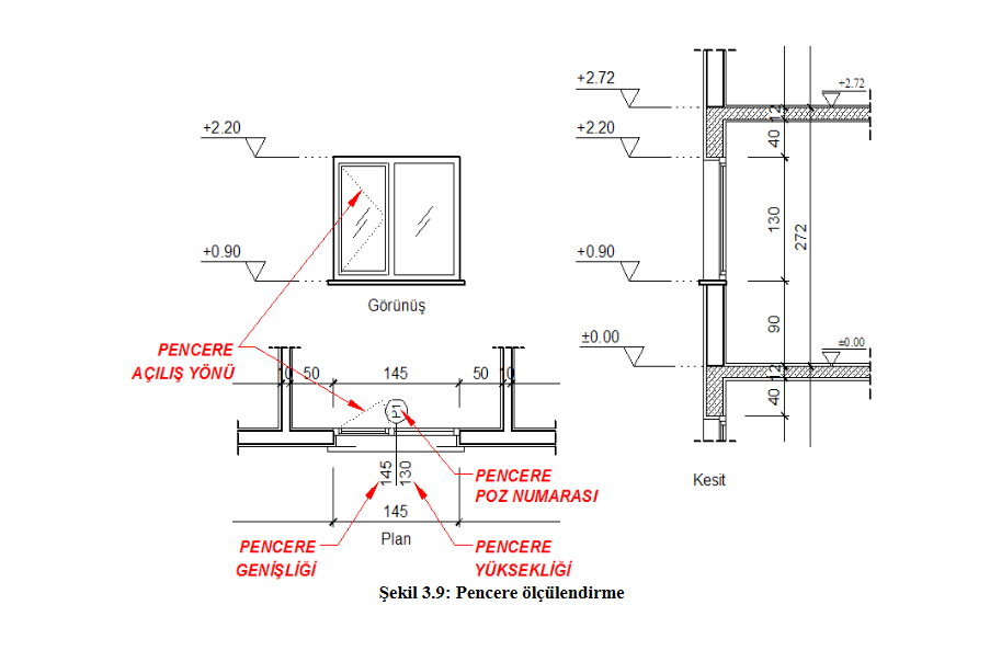 Bir kapı kasa ve kanat olmak üzere iki kısımdan oluşur. Kapı genişliği ve yüksekliği kullanım amacına göre değişir. Pencere de kasa ve kanat olmak üzere iki kısımdan oluşur. Kapı ve pencereler projelere göre farklılık gösterirler, fakat kapı standart olarak 210/90 (kasa hariç), pencere ise 150/130 olarak çizilir.