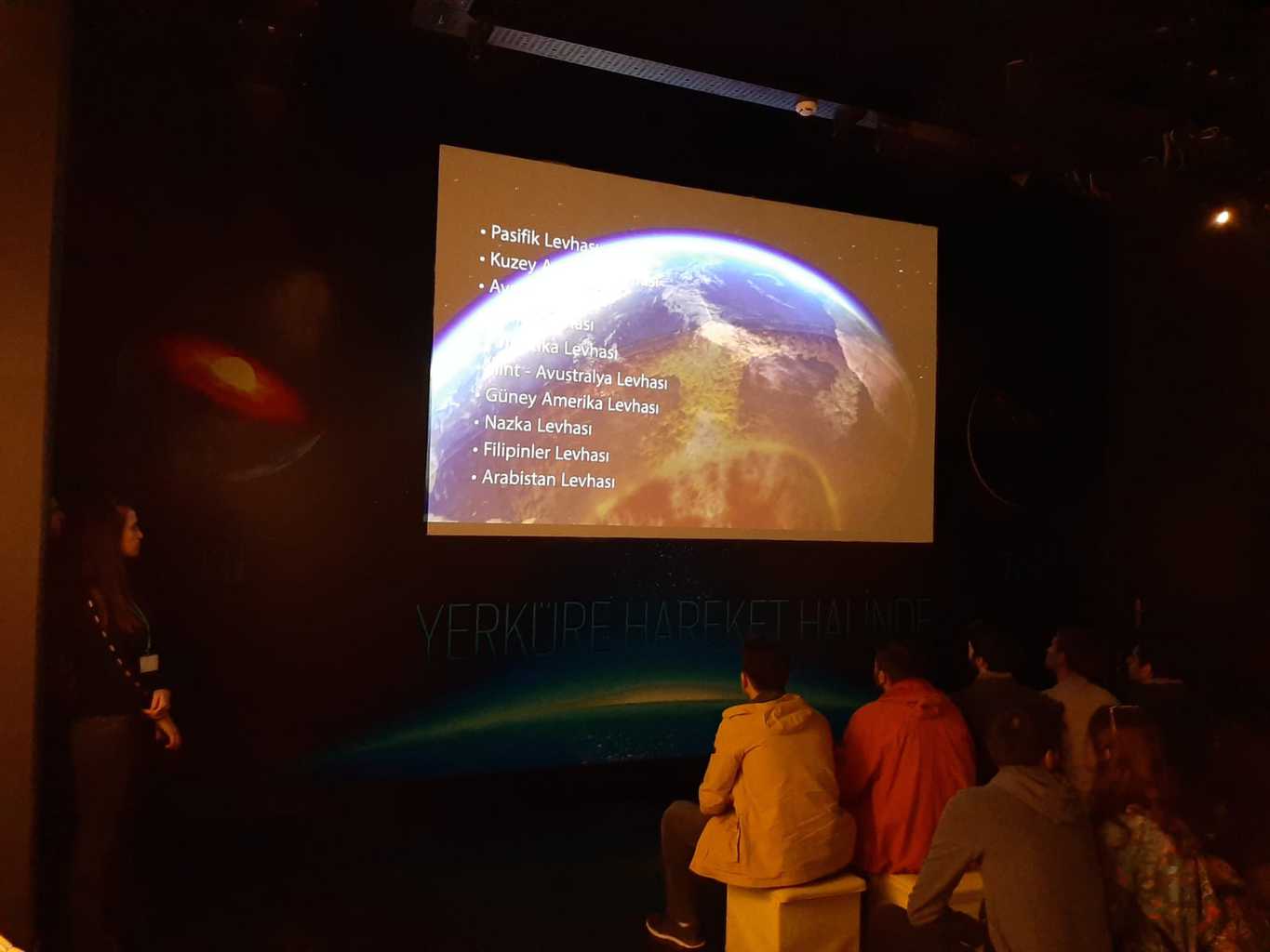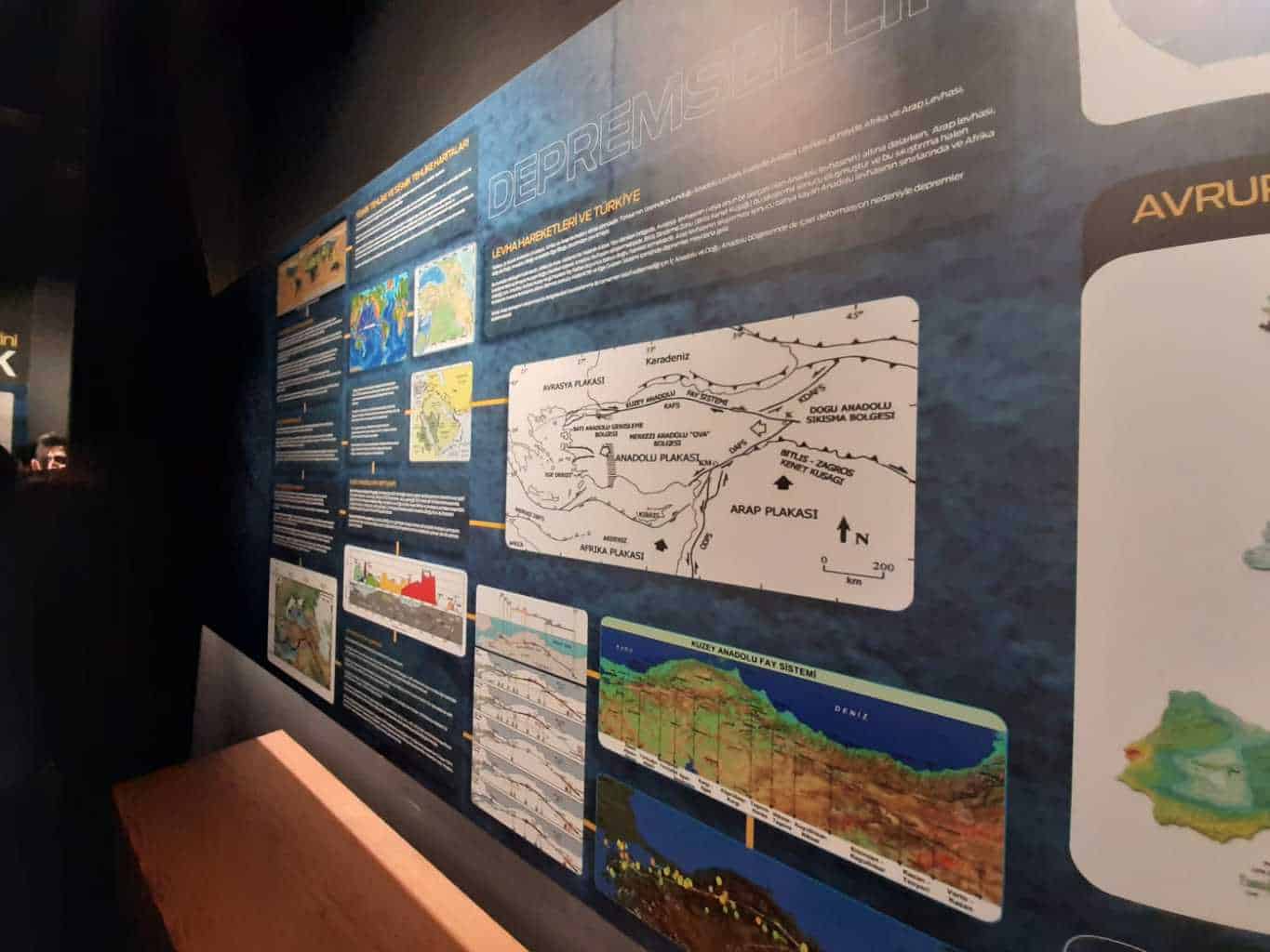 Haritaların olduğu bölümden, büyük bir ekranın ve koltukların olduğu adeta küçük bir sinema salonunu andıran bir yere geçiyoruz. Müze Rehberimiz bize üç dakikalık kısa bir film izleyeceğimizi söylüyor. Oturup dünyanın oluşumu, kıtalar ve deprem hakkındaki kısa belgeseli izliyoruz.