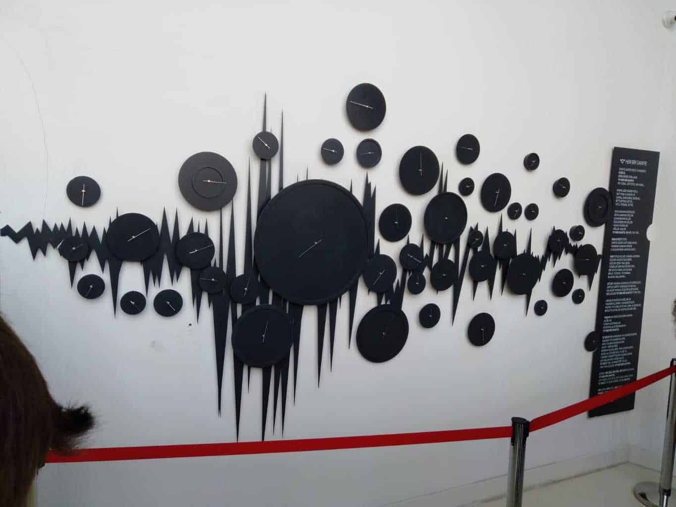 45 saniye süren depremde binlerce insanımızı kaybettik bu yüzden dersler çıkarmamız gereken unutmamamız gereken bir 45 saniye bu. İşte Müze; bunlar unutulmasın diye 45 adet irili ufaklı saat koymuş bu duvara ve bu saatler sadece saniyeleri gösteriyor ve her tur 45 saniye sürüyor. Ayrıca görsele iyice bakarsanız sismograf cihazına o gece düşen grafiği görebilirsiniz. Burasını da dikkatli inceledikten sonra duvarlarında, meydana gelen en büyük depremlerin isimleri ve görselleri bulunan bir koridora geçiyoruz.