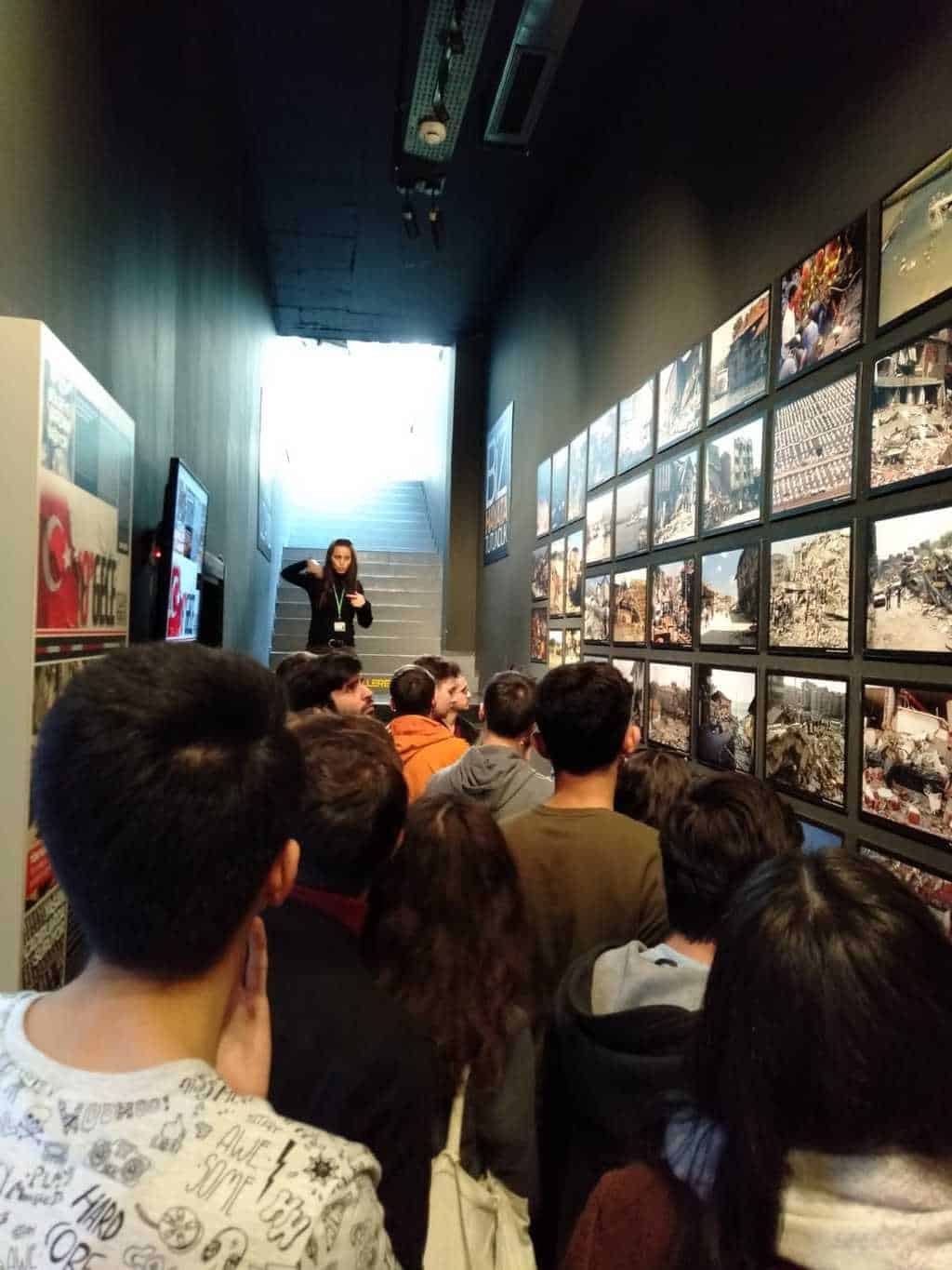 Bunu da izledikten sonra müze rehberi Fatma Gülle kısa filmi kapatıp. “Şimdi anlamak, hissetmek ve asla unutmamak için hep birlikte o anlara geri döneceğiz, yani sizinle zamanda bir yolculuğa çıkacağız, 17 ağustos gecesine gideceğiz.” Bunları söylerken küçük bir uyarıyı da ihmal etmiyor, deprem simülatörü odasına gideceğimiz için karanlık korkusu olan endişelenen yahut rahatsızlık duyacak kimselerin girmemesini istiyor.