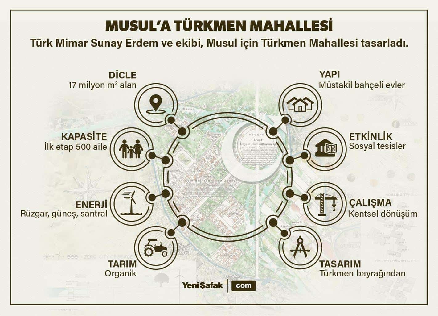 Son yıllarda terörün yakıp yıktığı Irak’ın tarihi kenti Musul’un terör örgütü unsurlarından temizlenmesinin ardından bölgede yaşamsal faaliyetler yeniden başladı. Türk Mimar Sunay Erdem ve ekibi, ay-yıldız formu taşıyan Türkmen Mahallesi için kolları sıvadı. İlk etapta 500 aileye yuva olacak olan proje, hayata geçirilmesi halinde Dicle’nin kıyısında yeni bir yaşam alanı oluşturacak.