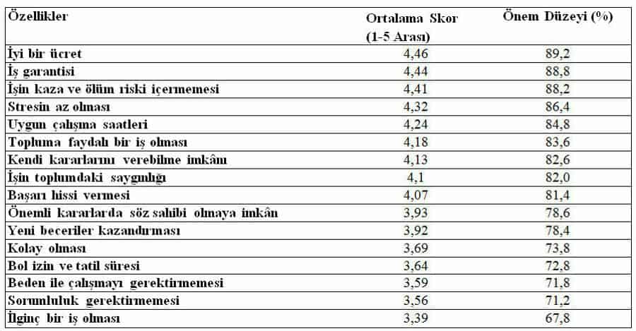 Araştırmaya katılanlara iyi bir işte olması gerektiği düşünülebilecek 16 özellik okunmuş ve kendilerinden 1-5 arasında bir puanlamaya tekabül edecek şekilde;