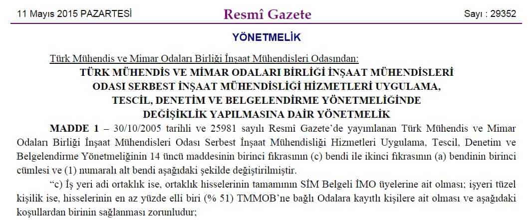 11 Mayıs 2015 Pazartesi Günü 29352 sayılı resmi gazetede yayınlanan İnşaat Mühendisleri Odası Serbest İnşaat Mühendisliği Hizmetleri Uygulama, Tescil, Denetim Ve Belgelendirme Yönetmeliğinde Değişiklik Yapılmasına Dair Yönetmelik
