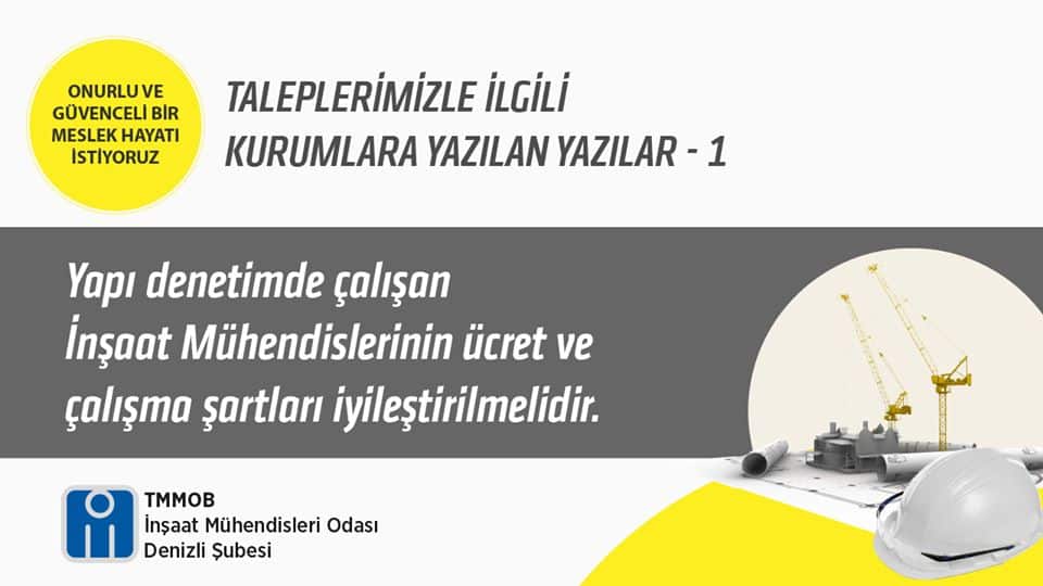 İnşaat sektörü ile ilgili her gün yeni olumsuz haberlerin geldiği bu zamanlarda her inşaat mühendisi topluluğu kendi çapında bir şeyler yapmaya, bu olumsuzlukları üst makamlara bildirerek İnşaat mühendislerinin iş ve meslek hayatını daha yaşanılabilir hale getirmeye çalışıyor. Denizli İnşaat Mühendisleri odası  (Denizli İMO) yapı denetimde çalışan İnşaat mühendislerinin ücret ve çalışma şartları iyileştirilmek adına söz konusu kurumlara aşağıdaki yazıyı hazırladı.