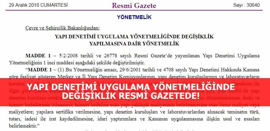 29 Aralık 2018 Tarih 30640 sayılı Resmi Gazetede ise “Yapı Denetimi Uygulama Yönetmeliğinde Değişiklik Yapılmasına Dair Yönetmelik” yayımlandı. Yürürlüğe girme tarihi ise 01/01/2019.