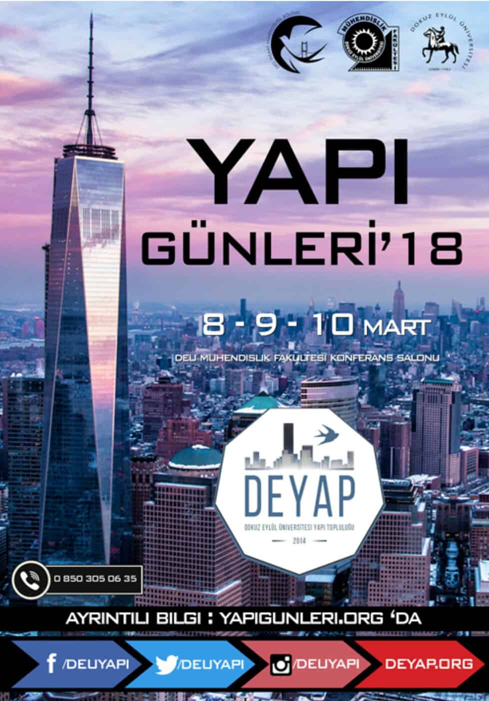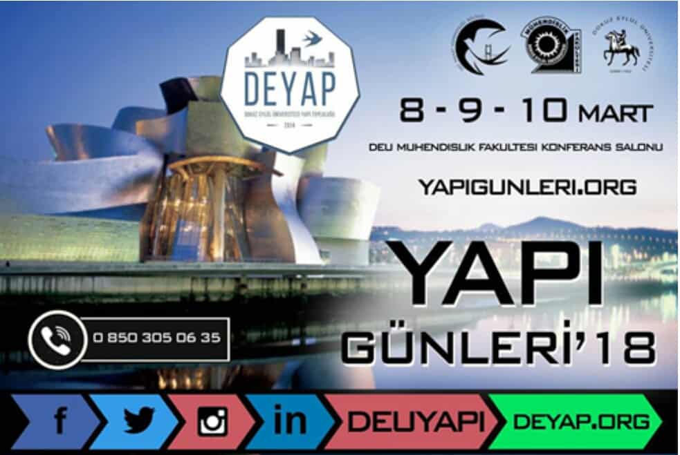 Dokuz Eylül Üniversitesi Yapı Topluluğu (DEYAP) tarafından düzenlenen Yapı Günleri’18, yapı sektörünün liderlerini 8-10 Mart tarihlerinde DEÜ Mühendislik Fakültesi’nde ağırlayacak.
