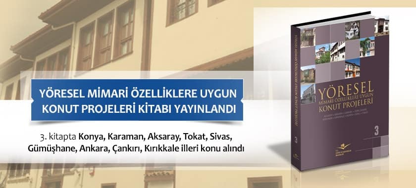 Bu çerçevede, Çevre ve Şehircilik Bakanlığının yürüttüğü “Yöresel Mimari Özelliklerine Uygun Konut Projeleri” çalışmaları kitaplaştırıldı. Hazırlanan 1. kitapta, Amasya, Balıkesir, Bursa, Edirne, Karabük, Rize ve Trabzon illeri; 2. Kitapta Denizli, Erzurum, Iğdır, Kars, Kayseri, Muğla, Nevşehir, Niğde, Şanlıurfa, Uşak illeri; Şubat 2018’de yayınlanan 3. Kitapta ise Konya, Karaman, Aksaray, Tokat, Sivas, Gümüşhane, Ankara, Çankırı, Kırıkkale illeri konu alındı.