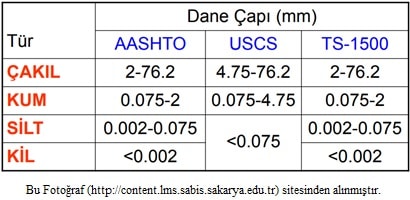 USCS, AASHTO, TS-1500 ise dane çapı(mm) ye bağlı olarak zemin sınıflandırmalarını bu şekilde göstermiştir. Burada dikkat çekmek istediğim konu, dane çapı küçüldükçe geçirimlilik de azalmaktadır. Bu tıpkı boş bir odaya koyulmuş çok büyük bir topun odada bırakacağı boşluk ile aynı odaya konulmuş binlerce küçük topun bırakacağı boşluk oranının kıyaslanması gibidir.