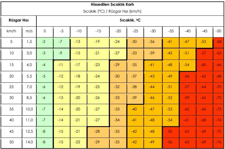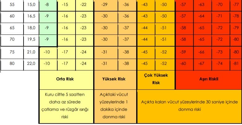Örneğin, -300C olan hava sıcaklığı 15 km/h rüzgar hızıyla birleştiği zaman deri sıcaklığı -410C olarak hisseder ve yaklaşık 2-10 dk arasında donar.