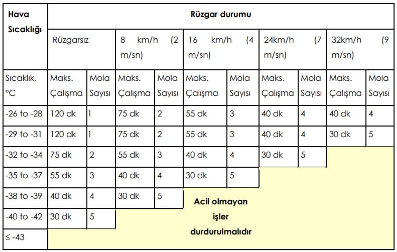Yukarıda sıralanan durumların dışında soğuğa maruziyeti kontrol etmek için bu önlemler yeterli olmayabilir. Hissedilen sıcaklık -320C‘den aşağı olduğu zaman derinin sürekli soğuk havaya maruz kalmasına izin verilmemelidir. Rüzgar hızı ne olursa olsun yüzeysel yada derin doku donmaları -100C altındaki sıcaklıklarda meydana gelir.