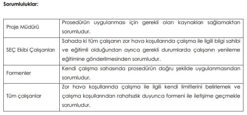 Firma, zor hava şartlarında yapılan saha çalışmalarında hava koşullarından dolayı ortaya çıkan riskleri en aza indirmek için uyulması gereken kurallar ve alınması gereken önlemleri belirlemeli ve tam olarak uygulamalıdır. Bu kurallar, firmanın yürüttüğü projeler kapsamında bulunan tüm çalışanın açık saha işleri sırasında yürüttüğü bütün faaliyetleri kapsamaktadır. Zor hava koşulları ile ilgili sağlık risklerine karşı en iyi koruma, bilinçli ve hazırlıklı olmaktır. Çalışanlar, hem kendilerindeki hem de başkalarındaki belirti ve semptomlarını fark etmelidir. Kol ve bacaklarda ki ağrı, ilk uyarı belirtisi olabilir.